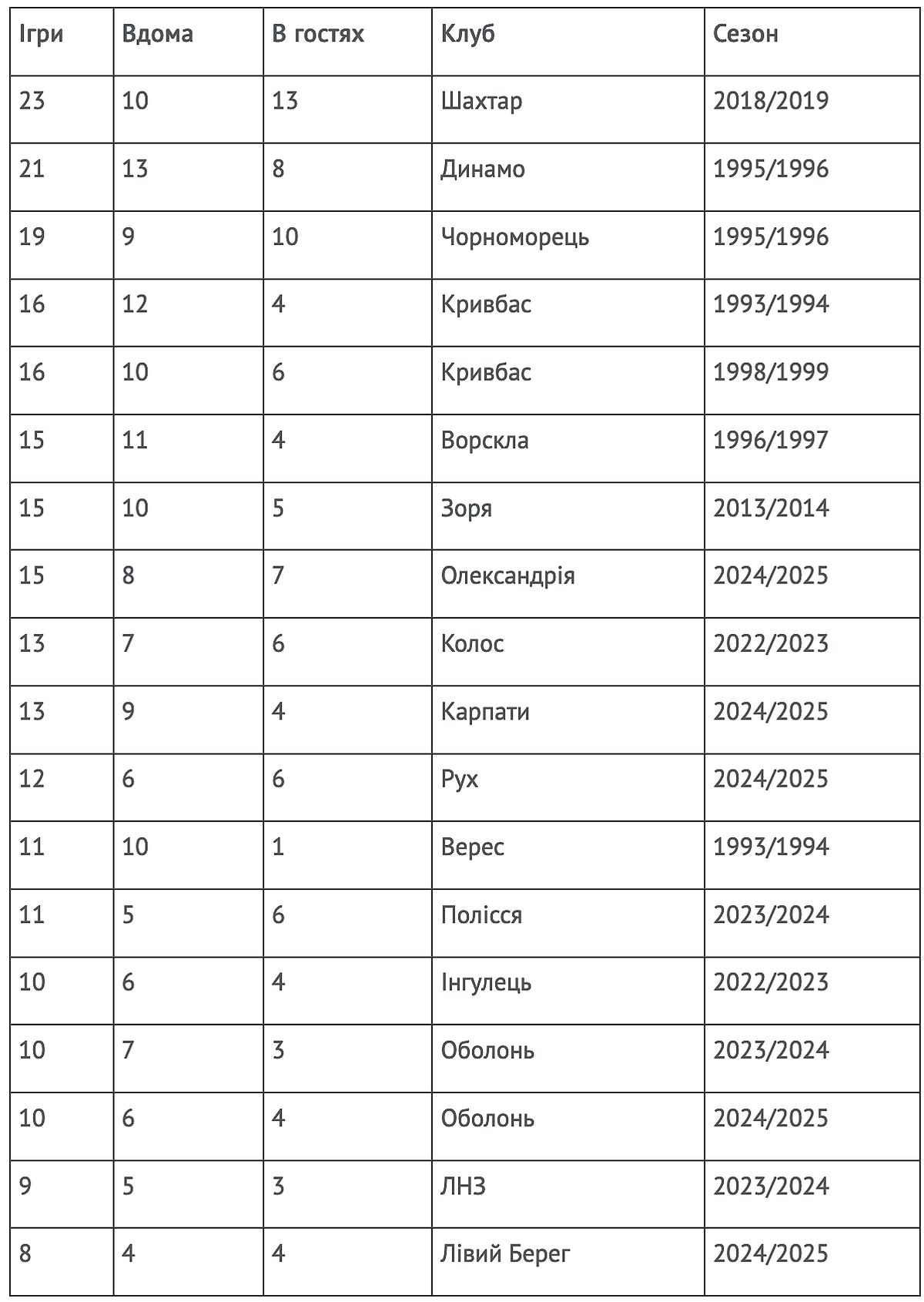 Кроме «Александрии» и «Карпат» подняли планку клубного рекорда игроки «Руха» (12 игр), а футболисты «Оболони» повторили клубное достижение в 10 игр.
