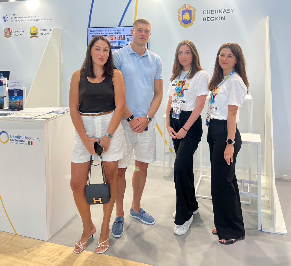 Артем Довбик у стенда Черкасской области на конференции по восстановлению Украины28-летний украинец, в числе прочего, побывал у стенда Черкасской области, откуда он родом.