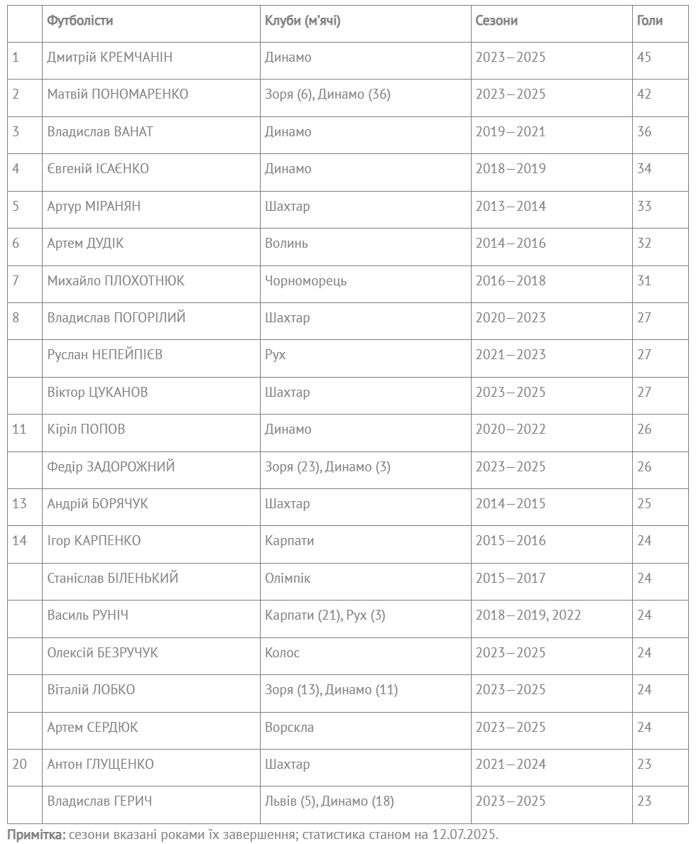 Перед началом сезона 2024/25 исторический список лучших бомбардиров чемпионата Украины U-19 возглавлял динамовец Владислав Ванат (36 голов). А по ходу сезона это голеадорское достижение сумели улучшить еще двое представителей «Динамо» — Дмитрий Кремчанин (45) и Матвей Пономаренко (42).