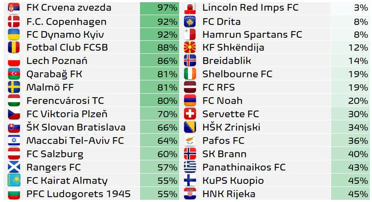 Наивысшими шансы на успех оказались у белградской «Црвены Звезды» (97%), которая сыграет с гибралтарским клубом «Линкольн Ред Импс».