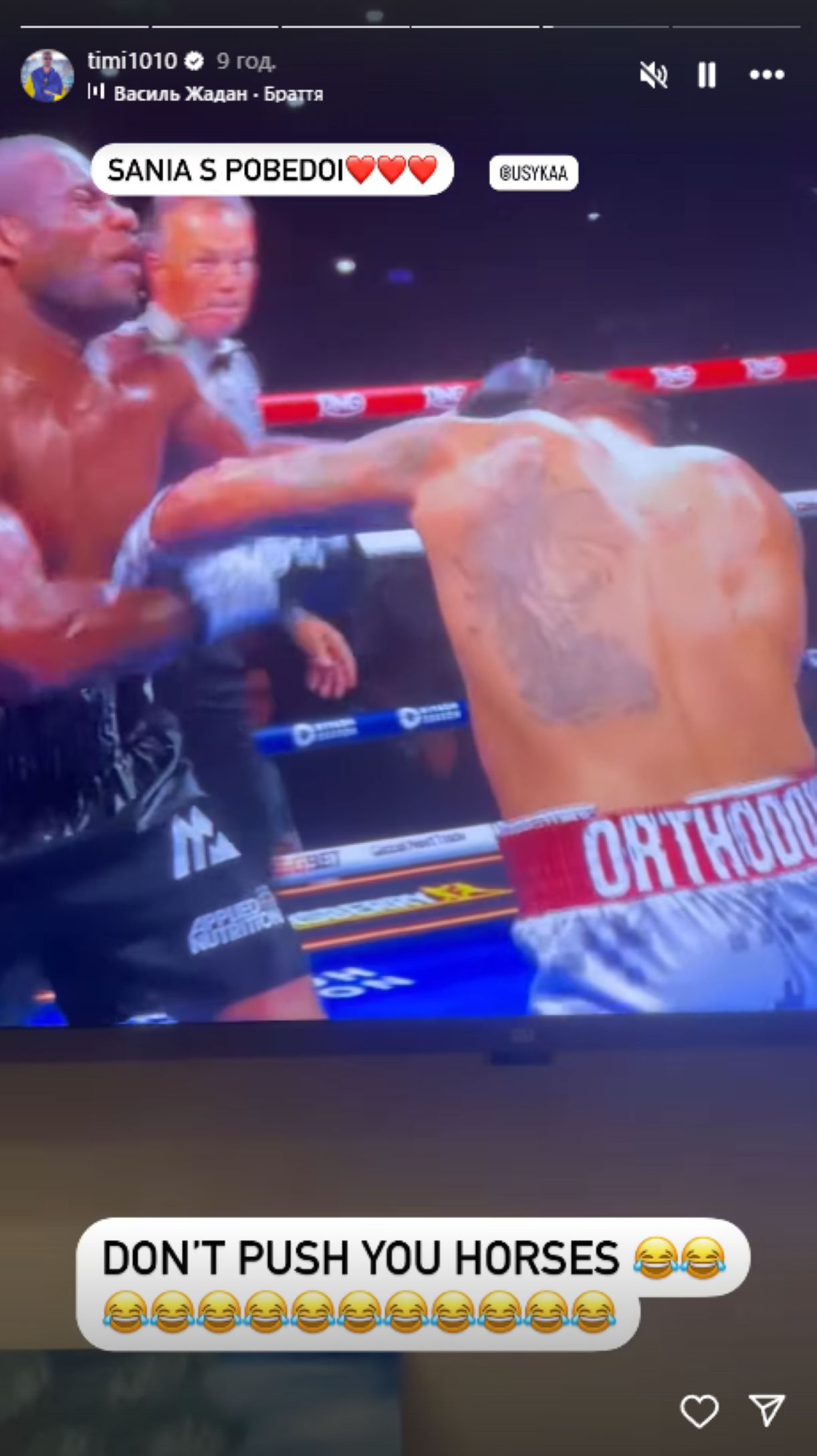 Добавим, что фраза «Don’t push the horses»(не гоните лошадей — прим.) была сказана Усиком на пресс-конференций перед боем, когда представители соперника начали говорить, что Дюбуа легко победит в этом поединке.