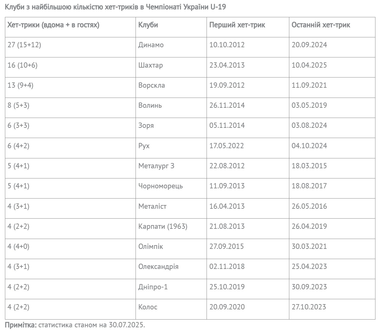 Клубы с наибольшим количеством хет-триков в чемпионате Украины U-19