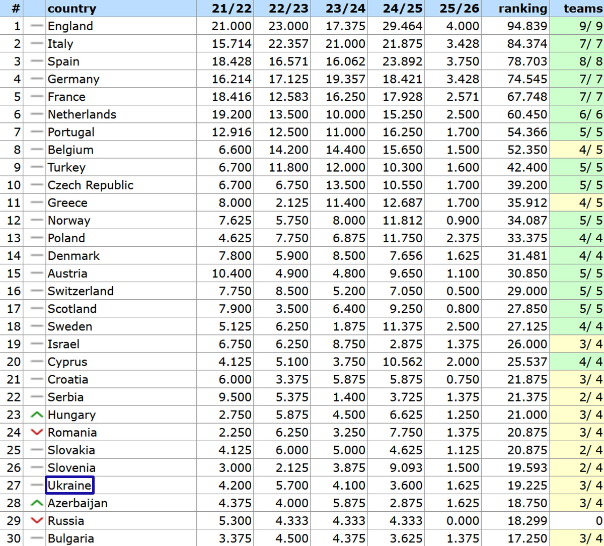 Напомним, что итоговая таблица коэффициентов УЕФА в нынешнем сезоне будет определять представительство стран в еврокубках сезона-2027/28.