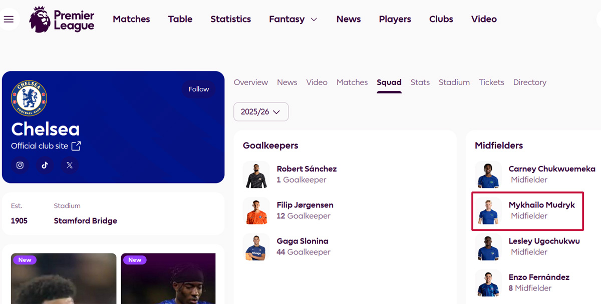 Украинский полузащитник лондонского «Челси» Михаил Мудрик, чьи допинговые пробы «А» и «Б» оказались положительными, присутствует в заявке своего клуба на чемпионат Англии сезона-2025/26, которая доступна на официальном сайте АПЛ.
