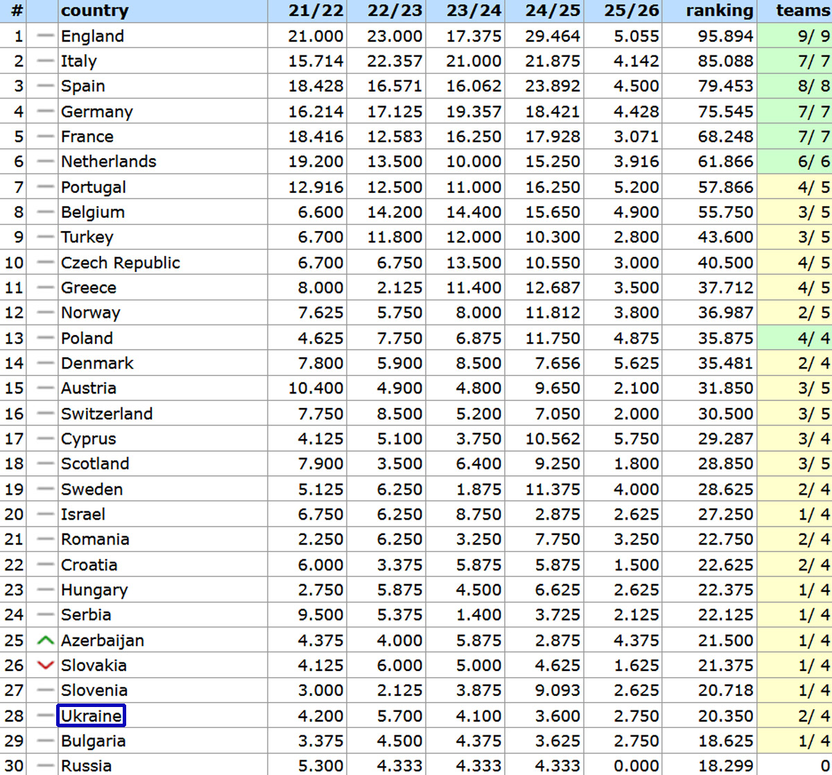 Напомним, на этой неделе проходили лишь матчи Лиги чемпионов, так что Украина не могла повлиять на любые изменения в таблице коэффициентов. С другой стороны, Азербайджан, который перед стартом еврокубкового сезона-2025/26 находился ниже Украины, обошел Словакию и теперь уже на 25-м месте.