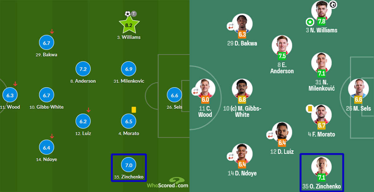 Схожим образом игру Зинченко оценил и SofaScore. В данном случае у Зинченко 7.1 балла (столько же у Николы Миленковича) и это опять-таки третий показатель в «Ноттингеме» — после упомянутые Андресона (7.5) и Уильямса (7.8).