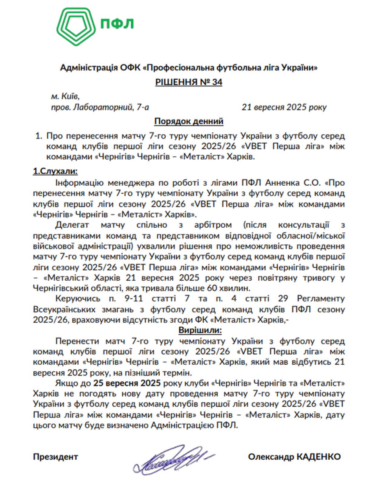 Если до 25 сентября 2025 года клубы „Чернигов“ Чернигов и „Металлист“ Харьков не согласуют новую дату проведения матча 7-го тура чемпионата Украины по футболу среди команд клубов первой лиги сезона 2025/26 „Первая лига“ между командами „Чернигов“ Чернигов — „Металлист“ Харьков, дата этого матча будет определена Администрацией ПФЛ», — говорится в решении.