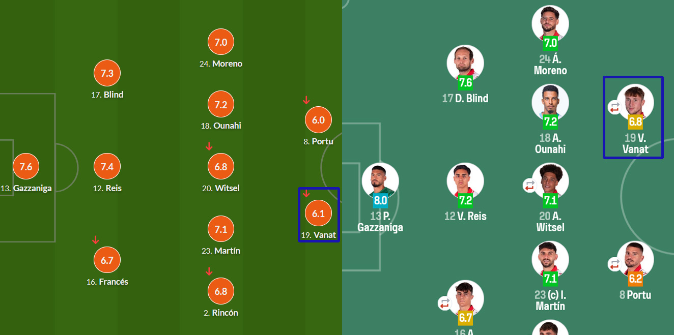 Чуть выше игру Ваната оценил SofaScore. В данном случае у нападающего 6.8 балла, и это третий худший показатель в «основе» «Жироны» (после 6.2 и 6.7).