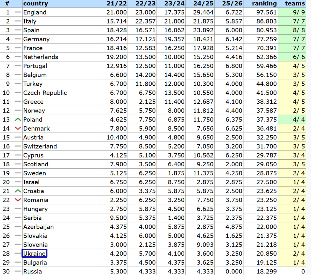Напомним, что итоговая таблица коэффициентов УЕФА в нынешнем сезоне будет определять представительство стран в еврокубках сезона-2027/28.