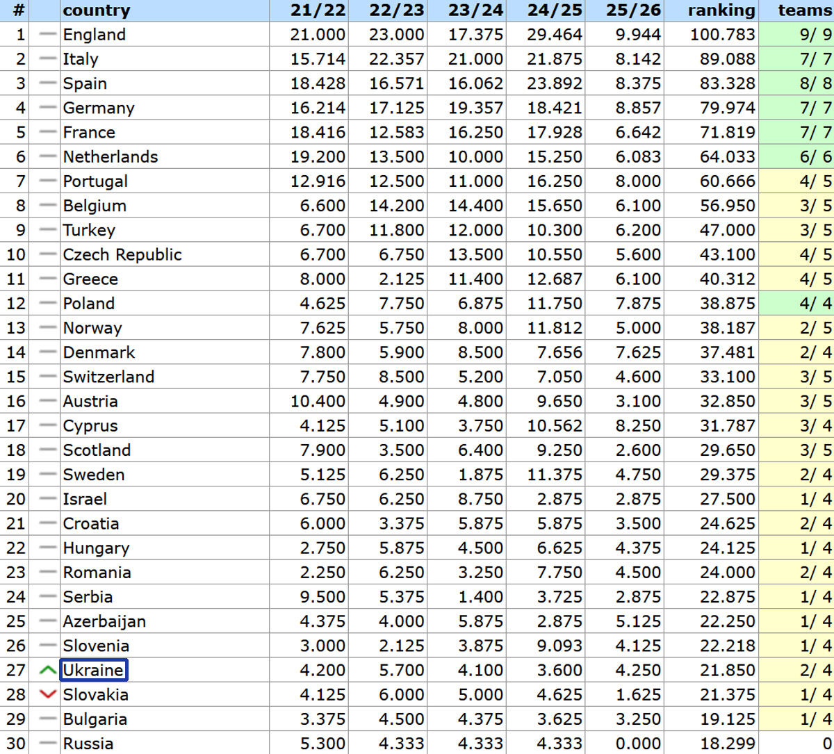 Напомним, что итоговая таблица коэффициентов УЕФА в нынешнем сезоне будет определять представительство стран в еврокубках сезона-2027/28.