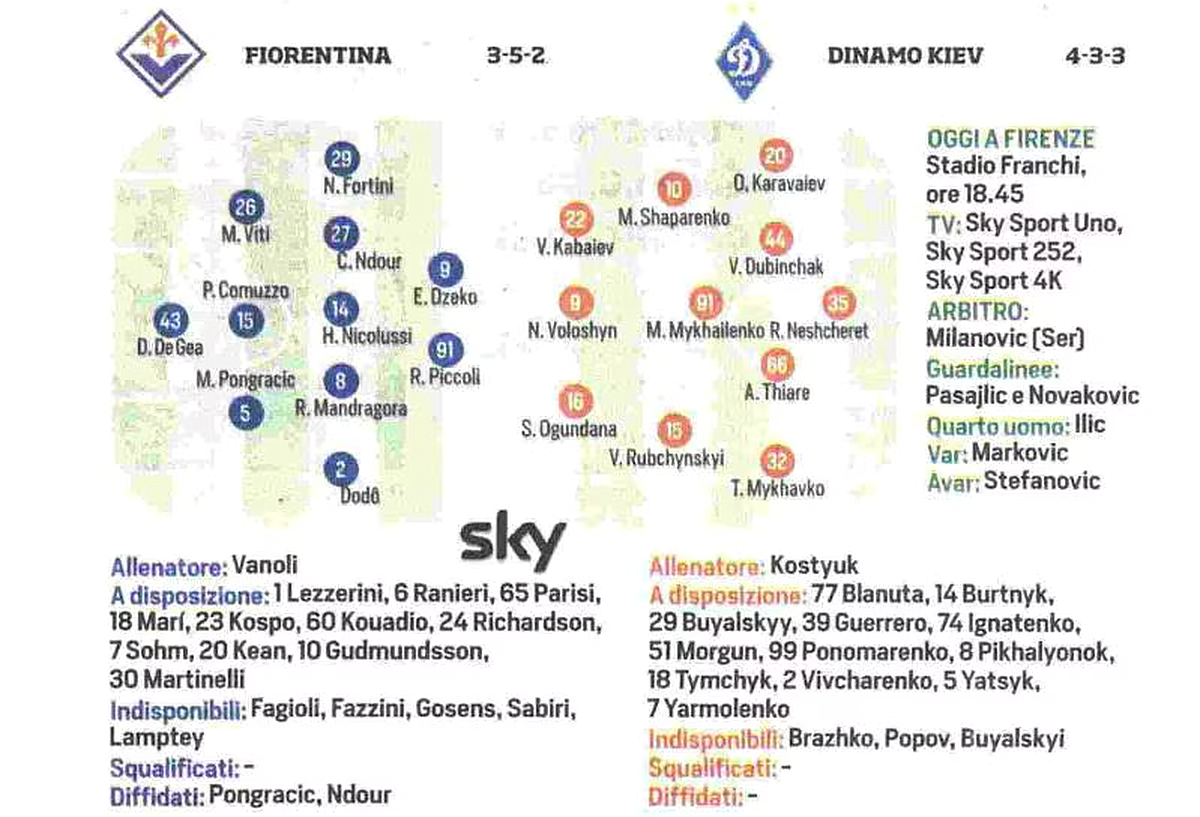 Il Corriere dello Sport опубликовала ориентировочные составы «Динамо» и «Фиорентины» на сегодняшний матч Лиги конференций.