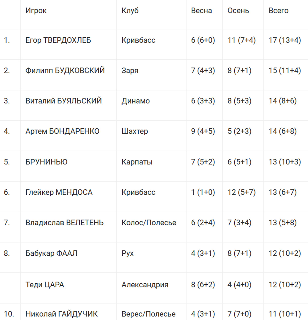 Лучшим игроком чемпионата Украины за весь 2025 год (вторая часть сезона-2024/25 и первая часть сезона-2025/26) по системе «гол+пас» стал 24-летний полузащитник «Кривбасса» Егор Твердохлеб.