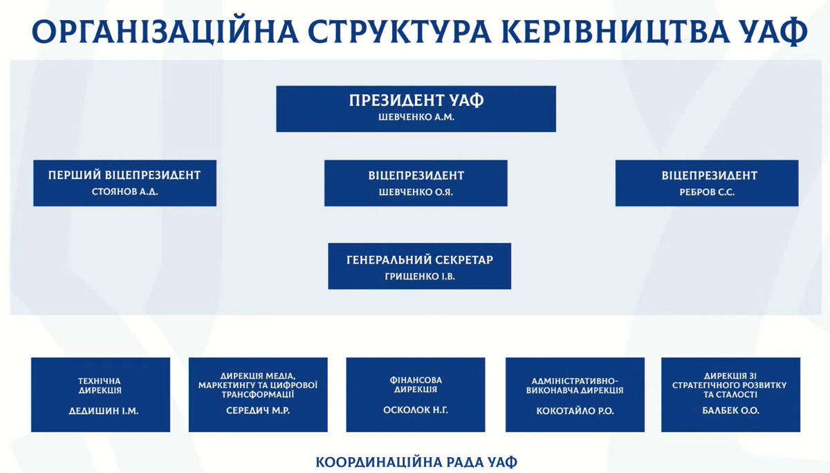 УАФ — это главный орган регулирования и развития футбола в Украине. Но наши ресурсы ограничены рамками, которые устанавливают наши главные стейк-холдеры: УЕФА и ФИФА. Бюджет УАФ практически неизменный, поэтому главное в деятельности УАФ — то, как команда распределяет эти деньги между направлениями, реальными проектами, которые приносят результаты. Главное в эффективности работы — создать команду людей, которые берут на себя ответственность и профессионально выполняют свои обязанности. Поэтому представляю новую оргструктуру администрации УАФ.