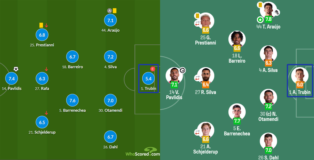 Аналогичным образом игру Трубина оценил SofaScore. В данном случае у вратаря 6.0 балла, что опять-таки является самой низкой оценкой в «Бенфике» и вторым худшим показателем матча — после 5.5. балла у упомянутого Виктора.