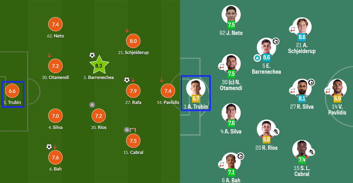 Аналогичным образом игру украинца оценил и SofaScore. В данном случае у Трубина 6.7 балла, что, опять-таки, самая низкая оценка в «основе» «Бенфики».