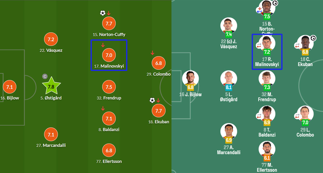 Иначе игру Малиновского оценил SofaScore: в данном случае у украинца 7.2 балла, и это пятый по рейтингу показатель в «основе» «Дженоа» — после 8.1, 7.5, 7.4 и 7.3.