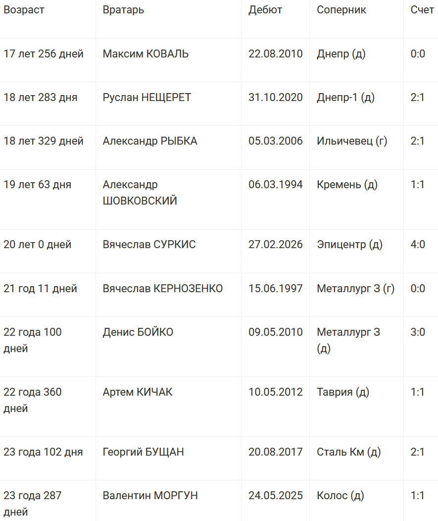 В более юном возрасте дебютировали за динамовцев только четыре вратаря — Максим Коваль, Руслан Нещерет, Александр Рыбка и Александр Шовковский.