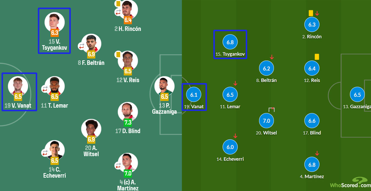 Несколько иначе игру украинцев оценил WhoScored. В данном случае Ванат получил 6.1 балла, и ниже в «Жироне» оценка лишь у Клаудио Эчеверри — 6.0 балла. А вот игра Цыганкова оценена высоко — 6.8 балла, это второй показатель в команде после 7.0 балла у Акселя Витселя.