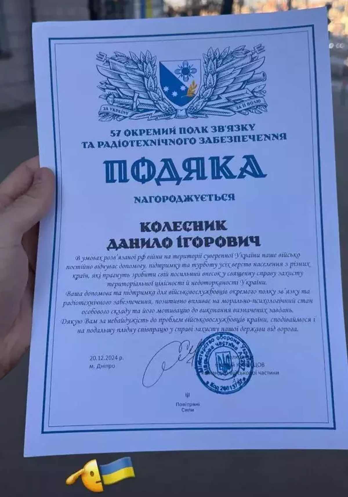 Бывший нападающий коваливского «Колоса-2» Даниил Колесник, который приобрел известность после скандальной ситуации, связанной с ТЦК, получил официальную благодарность от 57-го отдельного полка связи и радиотехнического обеспечения ВСУ.