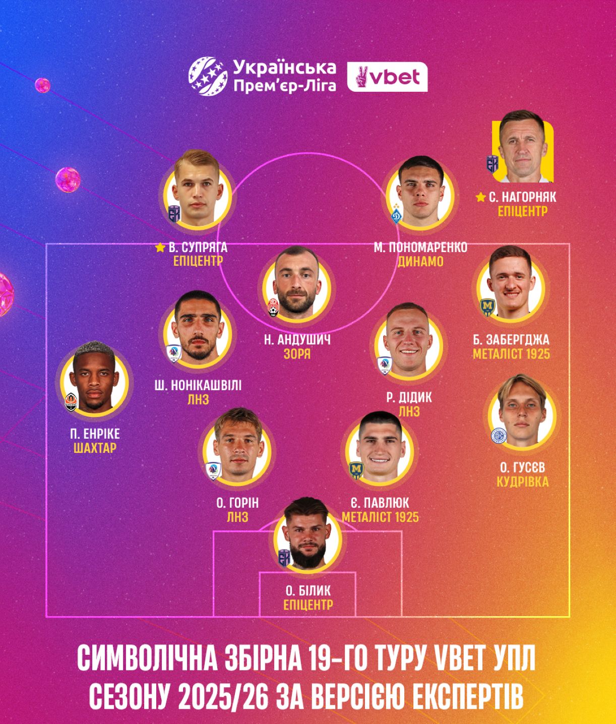 Сборная 19-тура: Билык («Эпицентр») — Гусев («Кудривка»), Павлюк («Металлист 1925»), Горин (ЛНЗ), Энрике («Шахтер») — Забергджа («Металлист 1925»), Дидык (ЛНЗ), Андушич («Заря»), Ноникашвили (ЛНЗ), Супряга («Эпицентр») — Пономаренко («Динамо»).