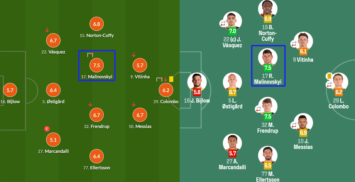Точно такую же оценку Малиновский получил и от SofaScore. В данном случае это тоже лучший показатель в «Дженоа» с тем лишь отличием, что 7.5 балла получил еще один игрок команды — Мортен Френдруп.