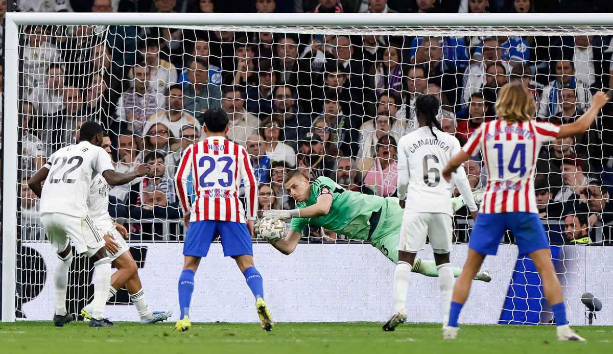 Один из сейвов Лунина в матче «Реал» — «Атлетико»По ходу этой встречи украинец совершил пять сейвов, а на незадолго до финального свистка Винисус Жуниор перед своей заменой передал Лунину капитанскую повязку.
