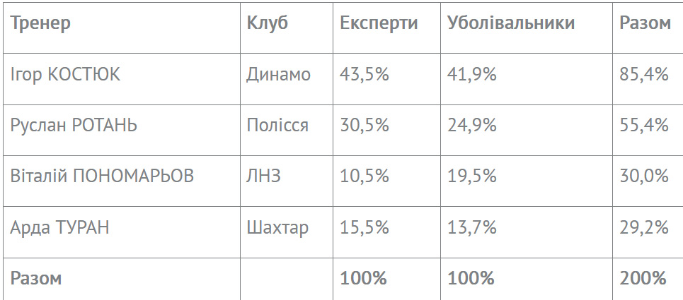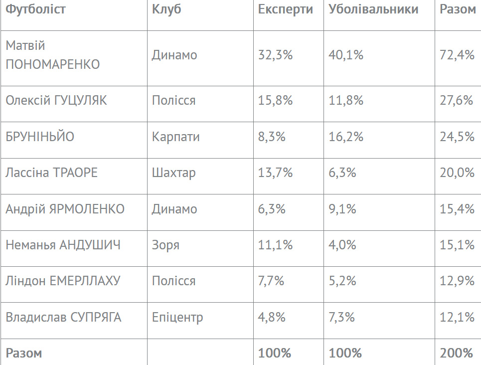 А на втором этапе состоялось собственное голосование: отдельное — среди болельщиков в интернете и отдельное — среди комментаторов, экспертов «УПЛ ТВ» и представителей СМИ. В каждом опросе кандидаты набирали баллы, которые традиционно были распределены по процентам. А потом были сложены вместе обе версии — болельщиков и экспертов.