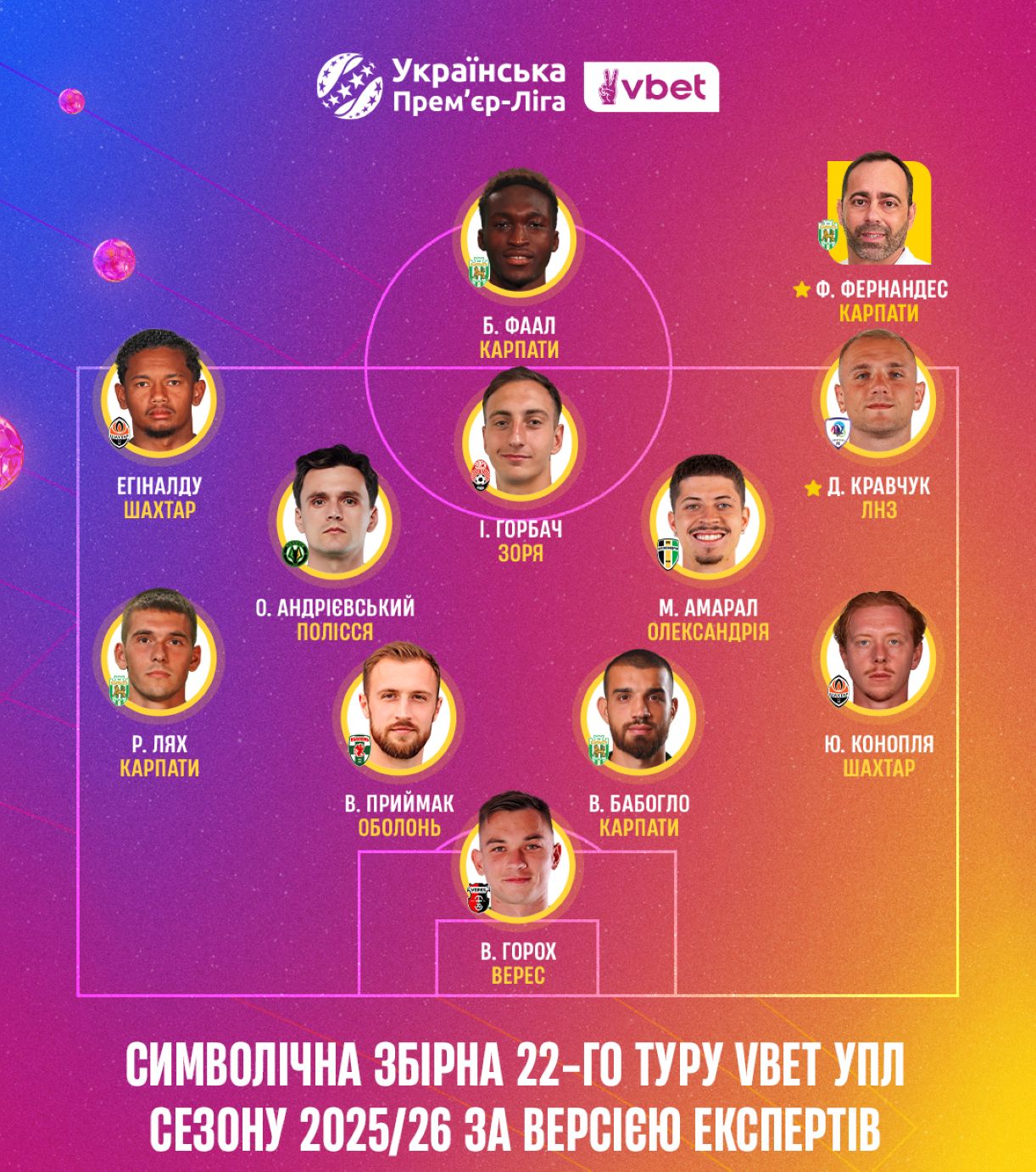 А звание лучшего футболиста 22-го тура получил герой матча в Кривом Роге между «Кривбассом» и ЛНЗ — Данило Кравчук, который отметился двумя голами. В топ-5 вошли ещё два автора дублей в этом туре — Эгиналду («Шахтёр») и Матеус Амарал («Александрия»), а также Бабукар Фаал («Карпаты») и Валентин Горох («Верес»).