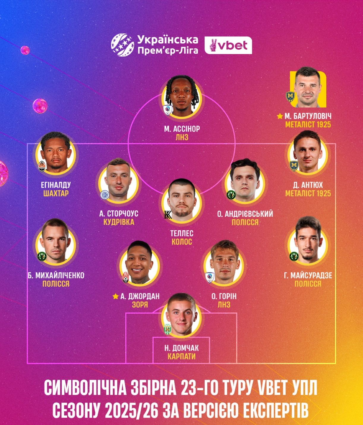 Сборная 23-го тура: Домчак («Карпаты») — Майсурадзе («Полесье»), Горин (ЛНЗ), Джордан («Заря»), Михайличенко («Полесье») — Антюх («Металлист 1925»), Андриевский («Полесье»), Теллес («Колос»), Сторчоус («Кудровка»), Эгиналду («Шахтёр») — Ассинор (ЛНЗ).