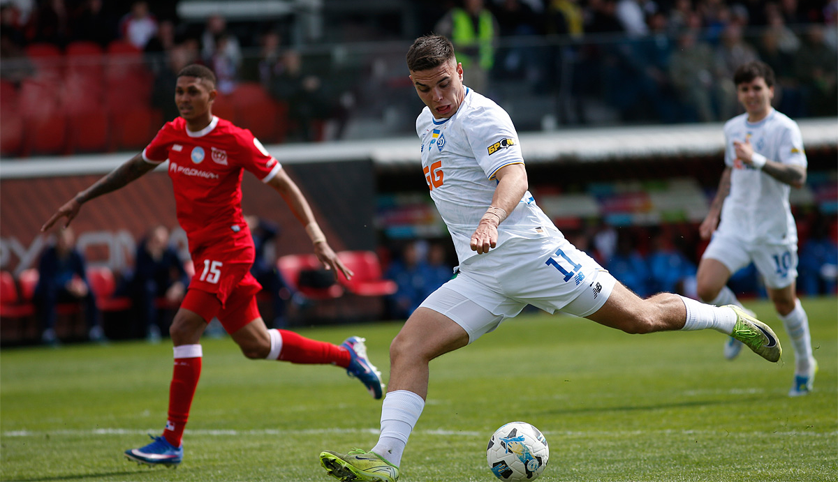 Матвей Пономаренко (в центре; фото: А. Попов)Матвей Пономаренко из «Динамо», забив «Кривбассу», снова единолично возглавил гонку — 11 забитых мячей.
