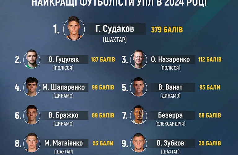 Кращим гравцем чемпіонату України 2024 року в опитуванні сайту «Збірна» футболісти та тренери визнали півзахисника «Шахтаря» та збірної України Георгія Судакова.
