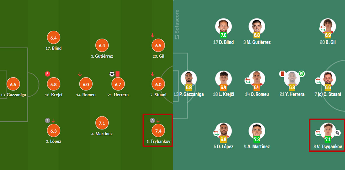 Схожим чином гру Циганкова оцінив і SofaScore. У цьому випадку українець отримав 7.1 бала, і вищу в «Жироні» оцінку має тільки Арнау Мартінес — 7.3 бала.