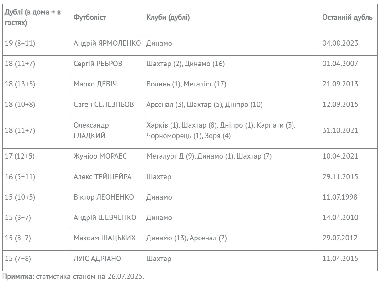 Футболісти з найбільшою кількістю дублів в чемпіонаті України