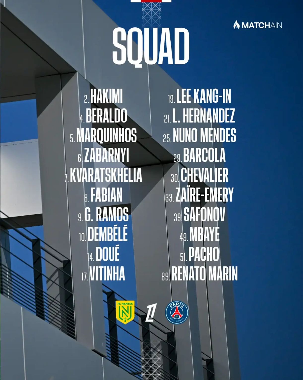 Прес-служба ПСЖ оприлюднила заявку команди на матч 1-го туру чемпіонату Франції проти «Нанта». У цьому поєдинку може дебютувати український захисник Ілля Забарний, який присутній у заявці парижан. Зустріч «Нанта» і ПСЖ розпочнеться сьогодні, 17 серпня, о 21:45 за київським часом.