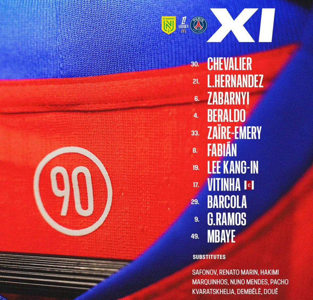 Стартовий склад ПСЖ на матч з «Нантом»: 30.Шавальє, 21.Ернандес, 6.Забарний, 4.Беральдо, 33.Заір-Емрі, 8.Руїс, 19.Кан Ін, 17.Вітінья (К), 29.Баркала, 9.Рамуш, 49.Мбайє.