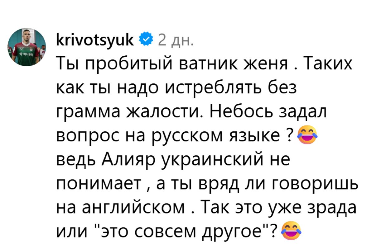 «Ти пробитий ватник, Женю. Таких, як ти, треба винищувати без краплі жалю. Мабуть, задав питання російською? Адже Аліяр української не розуміє, а ти навряд чи говориш англійською. То це вже зрада чи "це зовсім інше?».