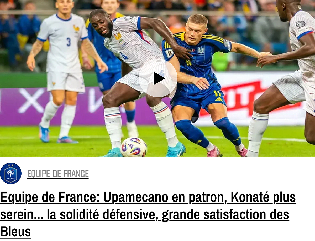 Французькі видання зазначають, що перший тайм лишився за командою Дешама. На 10-й хвилині Олісе відкрив рахунок точним ударом після чудової передачі з флангу, що стало логічним підсумком стартової переваги Франції. Журналісти хвалять впевнену гру оборони у першому таймі, а також активність Мбаппе, який хоч і не забив, створив кілька небезпечних моментів. «Швидше за все, саме таким був план Дешама: контроль м’яча та швидкий гол для заспокоєння суперника», — пише один із журналістів, наголошуючи на гарній тактичній підготовці Франції. «Однак уже тоді українці показали зуби. Склад із такими відомими гравцями, як Зінченко, Забарний, Судаков та Довбик, не збирався здаватися». Французи визнають, що перші 45 хвилин здалися надто простими, що зіграло злий жарт із командою після перерви.