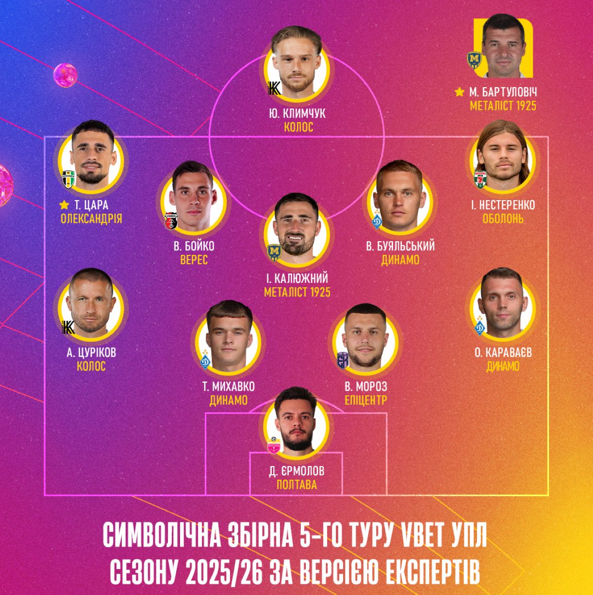 Збірна ж 5-туру набула такого вигляду: Єрмолов («Полтава»), Караваєв («Динамо»), Мороз («Епіцентр»), Михавко («Динамо»), Цуріков («Колос»), Нестеренко («Оболонь»), Буяльський («Динамо»), Калюжний («Металіст 1925»), Бойко («Верес»), Цара («Олександрія»), Климчук («Колос»).