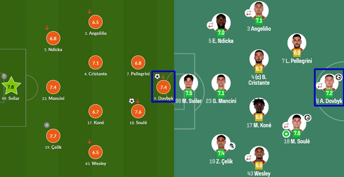 Артем ДовбикWhoScored поставив Довбику 7.4 бала, що стало лише четвертим показником серед гравців «Роми», які брали участь у матчі (після 7.8, 7.7 і 7.6).