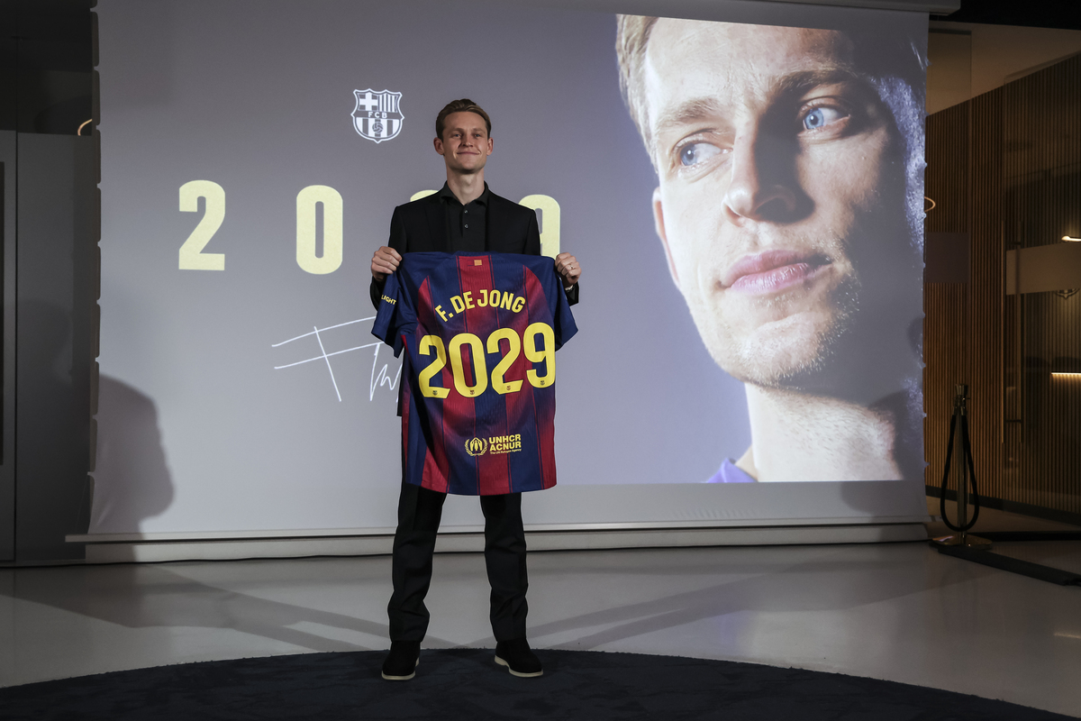 Френкі де Йонг, Getty ImagesНова угода нідерландського хавбека розрахована до літа 2029 року. Переговори між сторонами затягнулися на досить тривалий час, оскільки 28-річний футболіст зіткнувся з проблемами з пошуком агента, який має ліцензію на ведення переговорів.