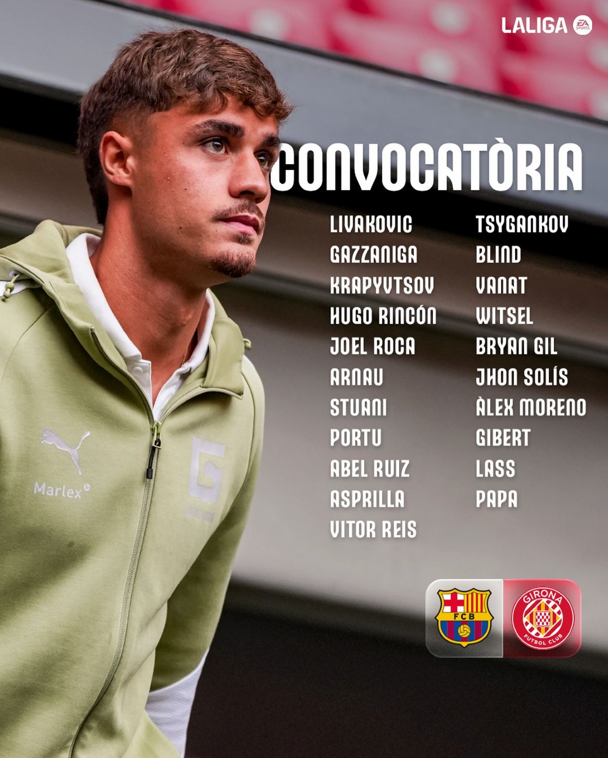 Прес-служба «Жирони» оприлюднила список футболістів, які потрапили у заявку команди на матч чемпіонату Іспанії проти «Барселони».