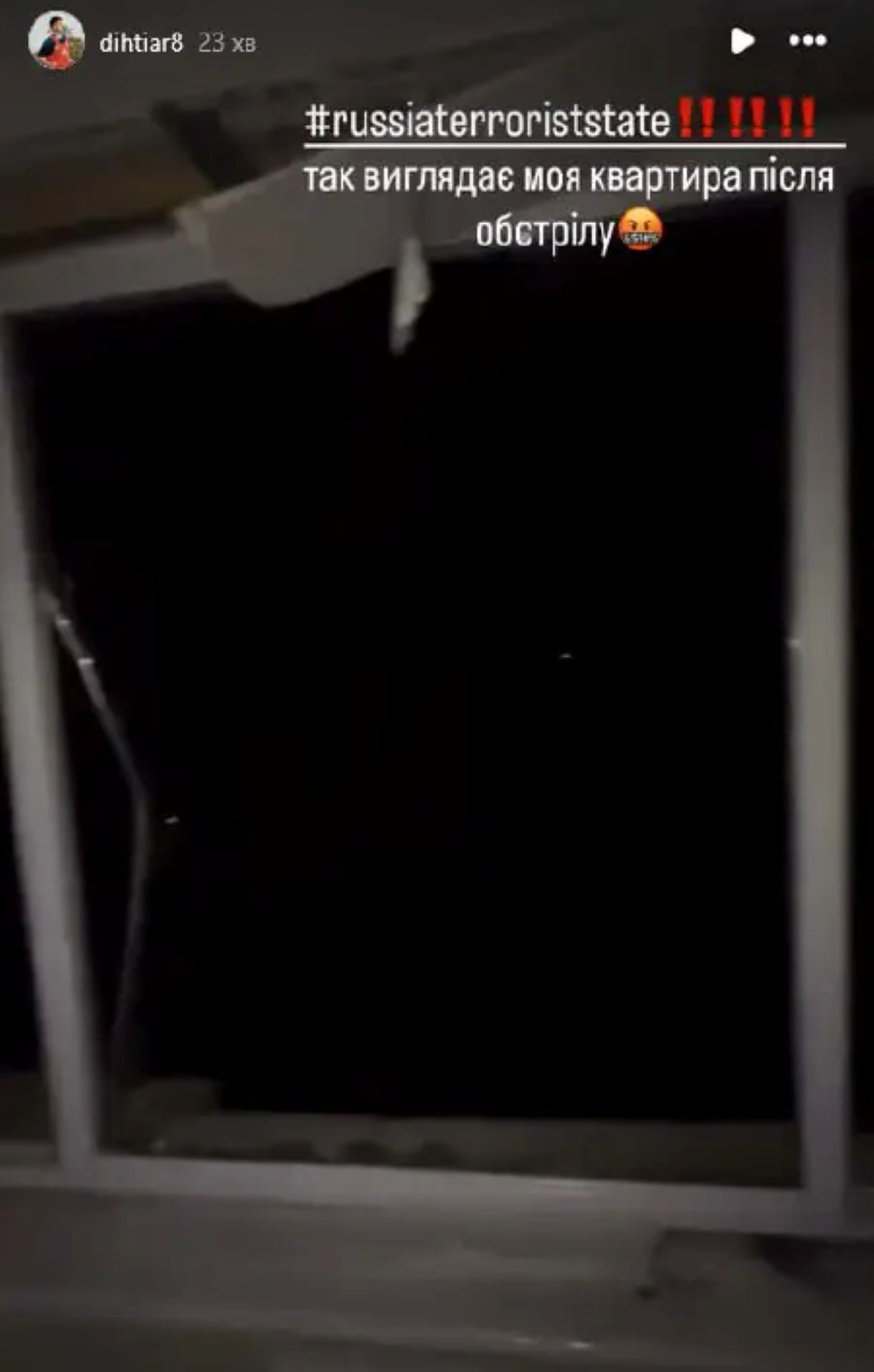 «Так виглядає моя квартира після обстрілу», — написав Дігтяр на своїй сторінці в мережі Instagram., додавши фотографію понівеченої квартири.