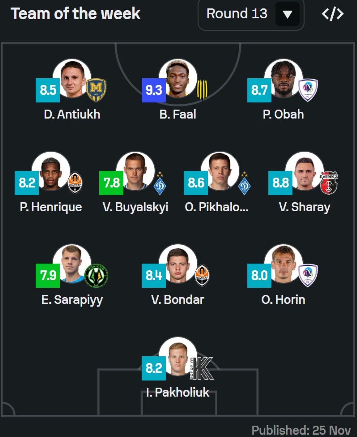 Додамо, що згідно з правилами порталу SofaScore, символічна збірна включає гравців з найвищими рейтингами на певних позиціях за конкретний тур. Вона формується на основі рейтингів футболістів за один матч того ж туру в рамках конкретного змагання.
