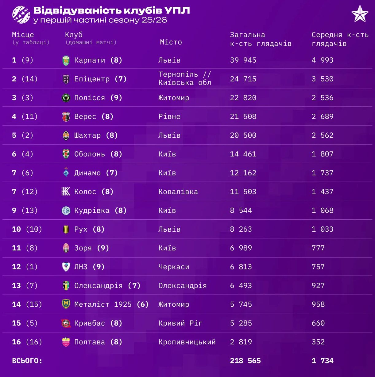 «Карпати» — безумовний лідер УПЛ за відвідуваністю, їхні домашні матчі в середньому збирали по 5 тисяч глядачів. Одразу 4 домашніх матчі львівʼян потрапили у топ-10 за кількістю присутніх вболівальників.