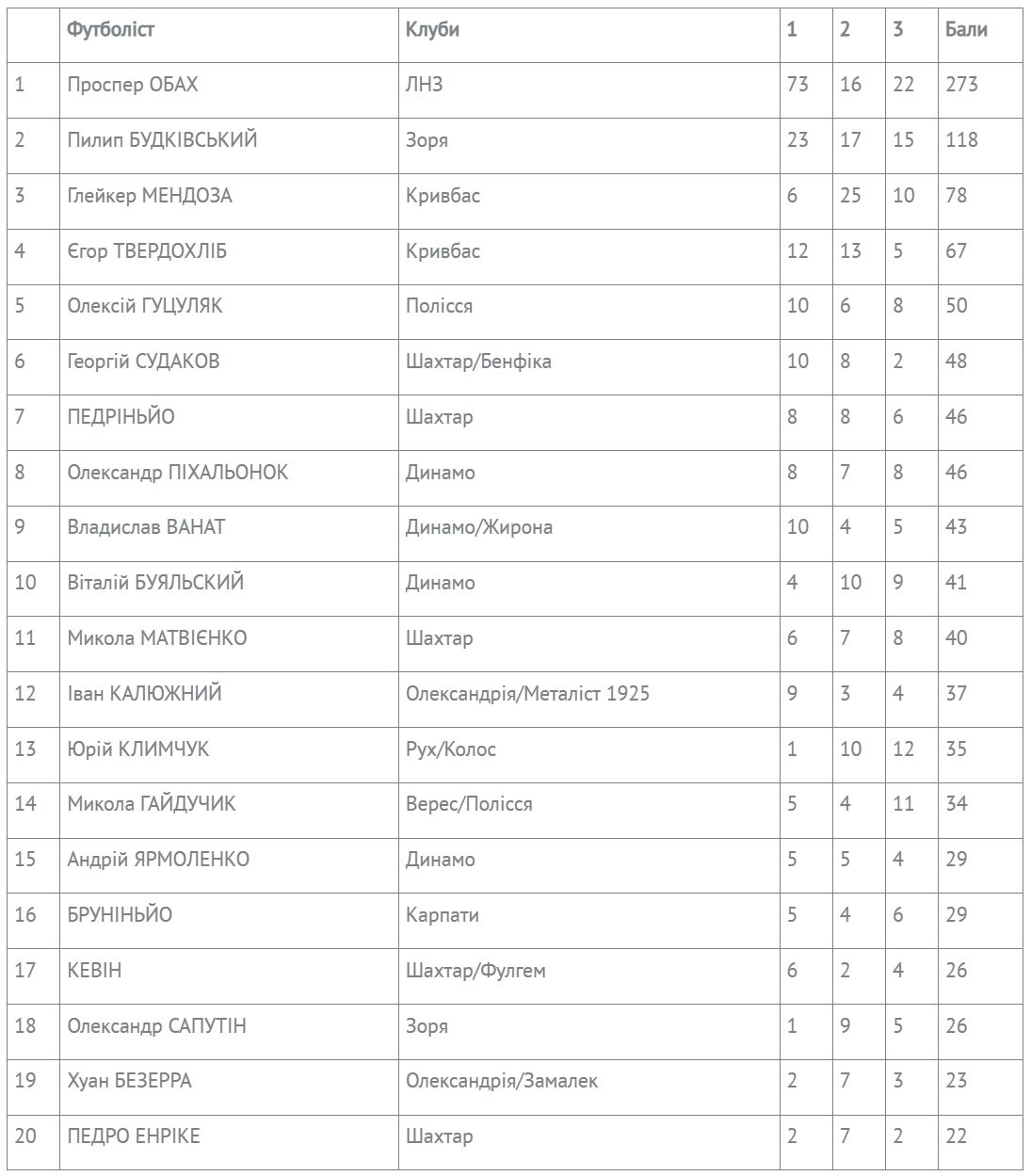 На другому місці форвард «Зорі» Пилип Будківський (118 балів), третім став півзахисник «Кривбасу» Глейкер Мендоза (78 балів).