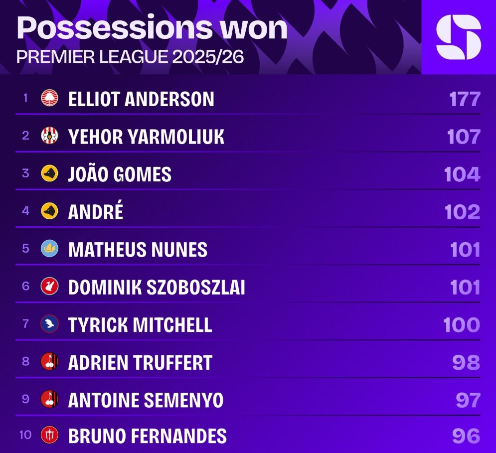 Єгор ЯрмолюкЯк повідомляє сторінка Squawka в мережі Х, Ярмолюк посідає друге місце серед усіх гравців АПЛ за кількістю виграних володінь мʼяча — 107. На першому місці хавбек «Ноттінгем Форест» Елліот Андерсон — 177.