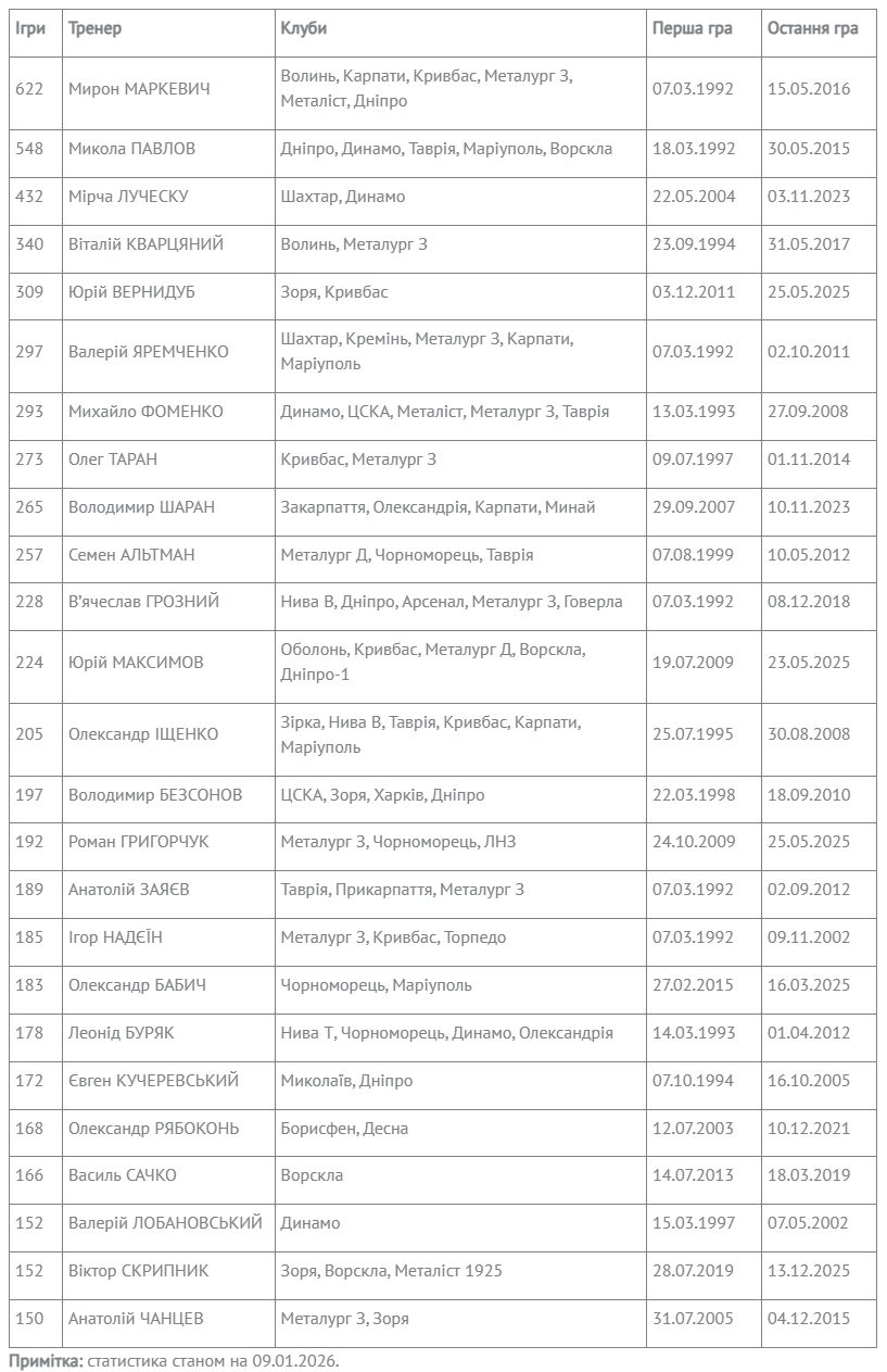 Тренери з найбільшою кількістю ігор в чемпіонаті України (1992—2025)