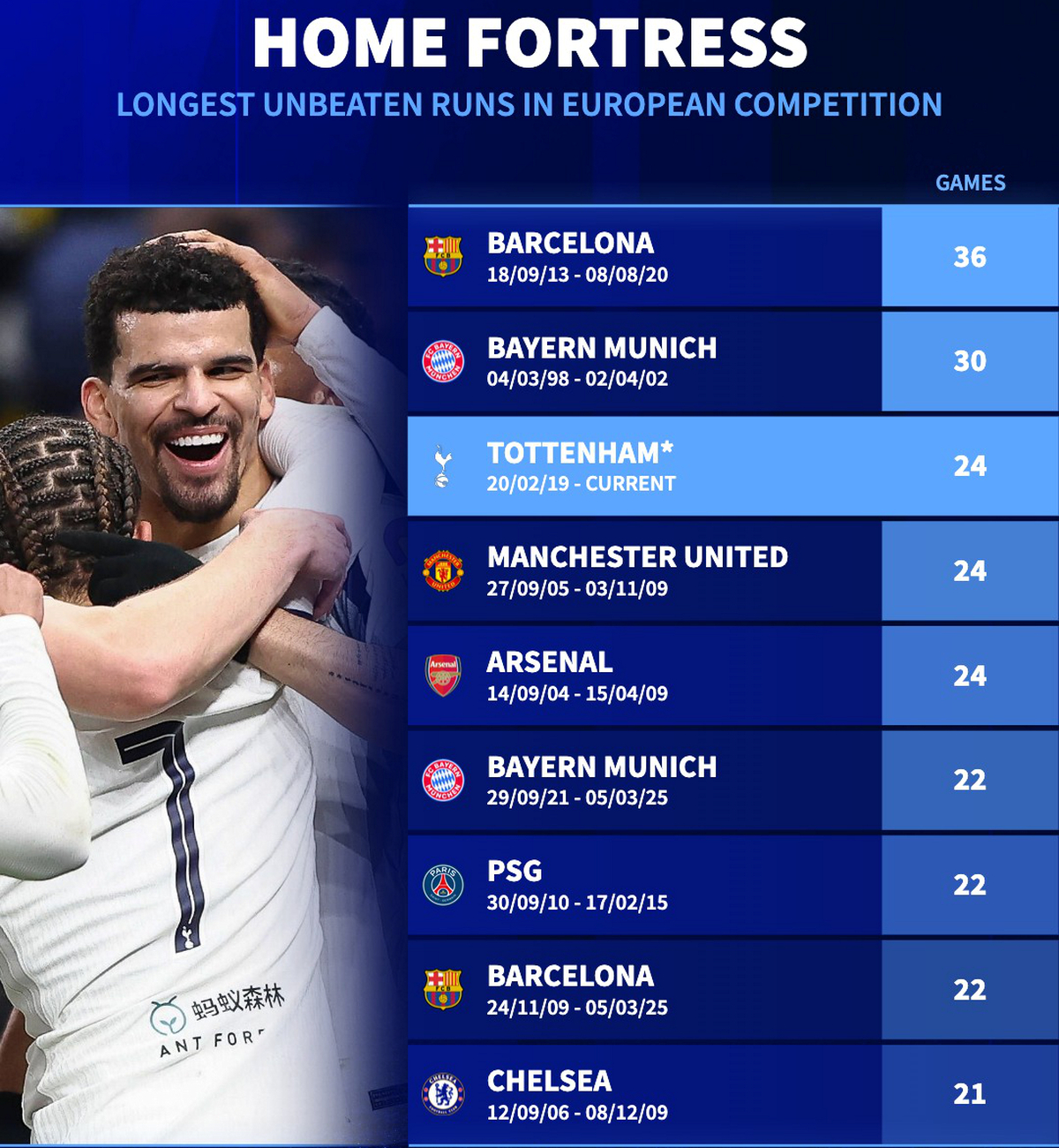Лондонці не програють на своєму полі в європейських турнірах з 20 лютого 2019 року й уже мають 24 матчі поспіль без поразок, що дозволяє їм ділити третє місце в історичному рейтингу.