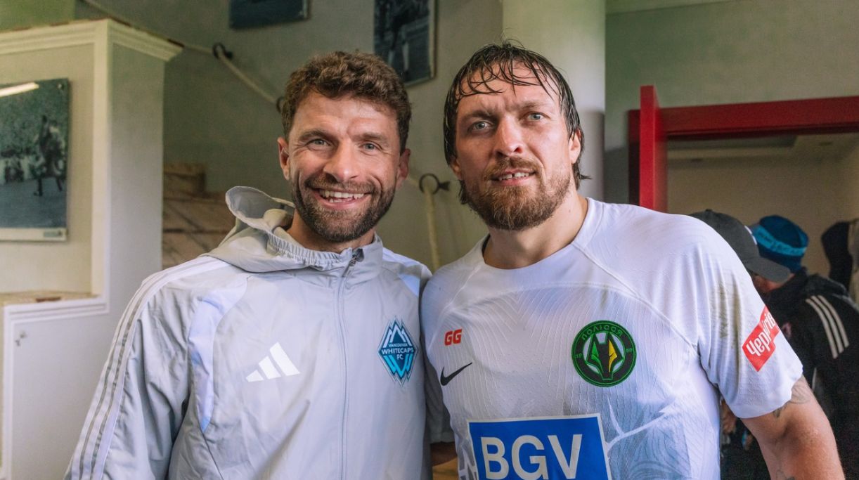 Знаменитий півзахисник мюнхенської «Баварії» Томас Мюллер, який нині виступає за «Ванкувер Уайткепс», і абсолютний чемпіон світу з боксу Олександр Усик зустрілися після завершення спарингу між канадським клубом і «Поліссям» (0:2). Легендарні спортсмени зробили спільне фото, яке опублікувала прес-служба «Ванкувер Уайткепс».