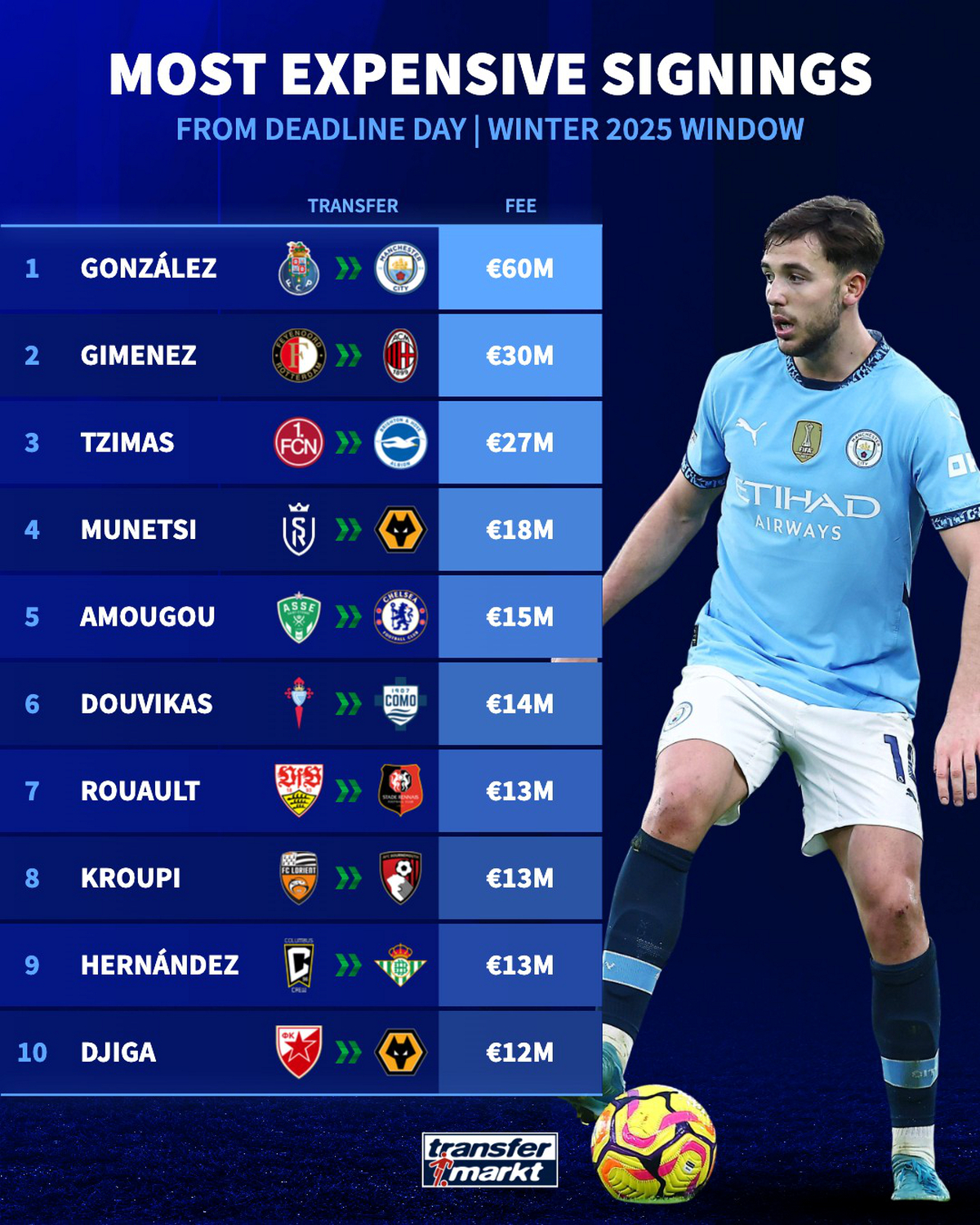 Найдорожчим підписанням став Гонсалес, який перебрався з «Порту» до «Манчестер Сіті» за 60 млн євро. Другу позицію в рейтингу посів Хіменес — його трансфер із «Феєнорда» до «Мілана» обійшовся в 30 млн євро, а трійку замикає Цимас, котрий перейшов із «Нюрнберга» до «Брайтона» за 27 млн євро.